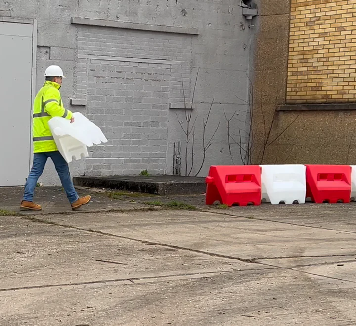 The barriers lock securely together, forming a continuous and stable cordon. They can be filled with water or sand to increase stability, making them resistant to wind and vehicle impact. When empty, they are lightweight and easy to move, allowing for convenient transport and storage.