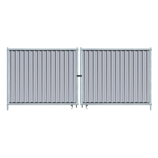 De Blockade™ Voertuig poort bestaat uit twee deuren van elk 2,2m, standaard uitgerust met zwenkwielen voor eenvoudig openen en sluiten. Dit maakt het mogelijk om elke deur onafhankelijk van de andere te openen of te sluiten, wat zorgt voor flexibele toegang tot het terrein. Voor extra beveiliging zijn beide poortdeuren voorzien van een slotbeugel en kan de Voertuig poort eenvoudig met een ketting en hangslot (niet bij de prijs inbegrepen) worden afgesloten. Hierdoor is de Blockade™ Voertuig poort niet alleen een praktische oplossing, maar ook een veilige keuze voor toegangscontrole tot uw bouwplaats.