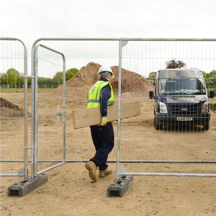 This gate offers a secure, durable, and practical solution for pedestrian access to construction sites or other fenced areas, combining safety with user-friendly operation. The sliding latch can be secured with a padlock and chain for added security. Designed for use with standard temporary fencing panels and fence feet for stable installation.